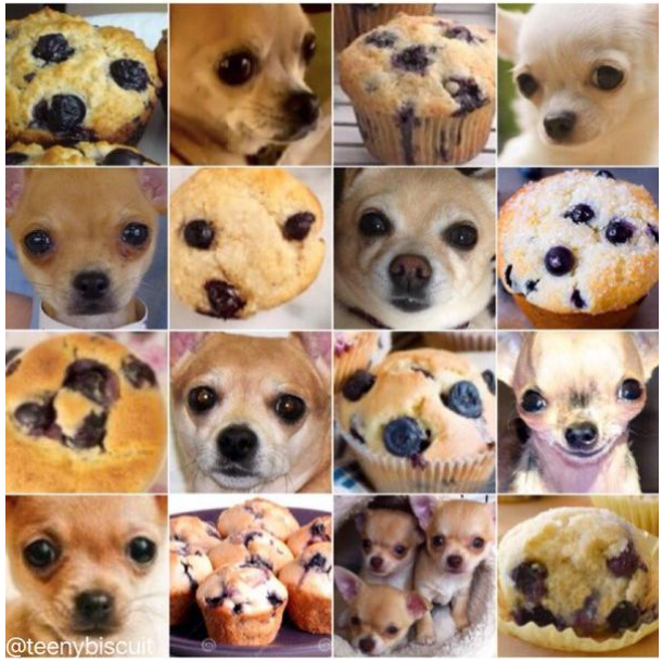 Aus diesem Grund kann es auch sein, dass das System Fehler macht. In dieser Collage erkennt das System in jedem Bild einen Hund, obwohl sich hier ein paar Muffins eingeschlichen haben.