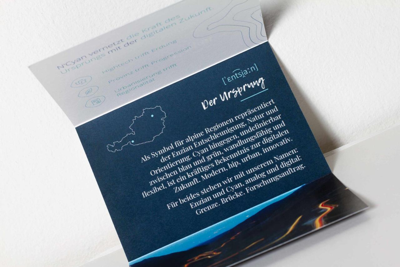 On the one hand, contour lines represent success, advancement and achievement of goals. Primarily, the bridge can be built here to the projects that receive support from N'Cyan. On the other hand, the eponymous Gentian ("Enzian" in German) grows exclusively at altitudes of 2,000 to 2,600 meters above sea level. The contour lines as a key visual thus stand for the natural unspoiledness of the Alps, where the association was launched, with a modern interpretation.